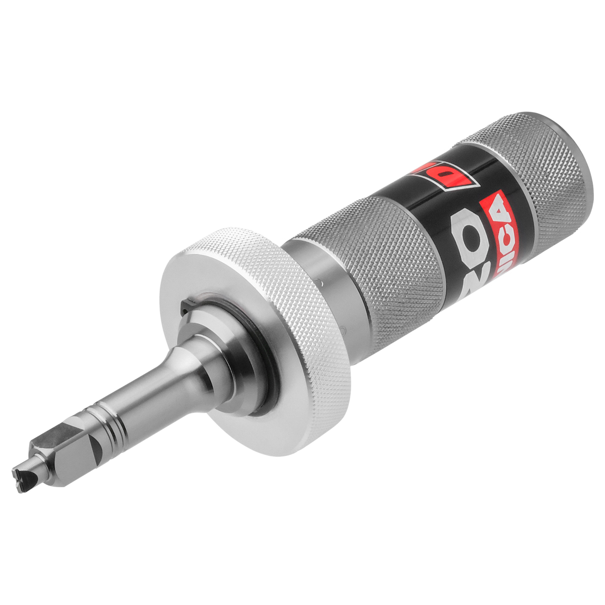 A flathead screwdriver is integrated at the tip, allowing adjustment of the low-speed COMP adjuster as well.
