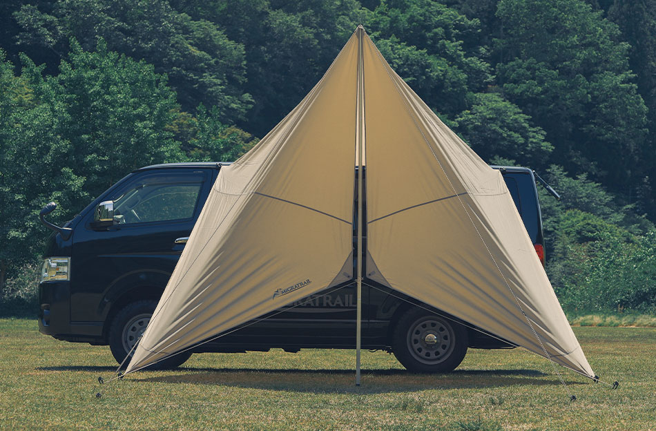 設営時には、ヘキサタープのようなエッジが利いた美しいシルエットとワンポイントMIGRATRAILロゴ入り。 -