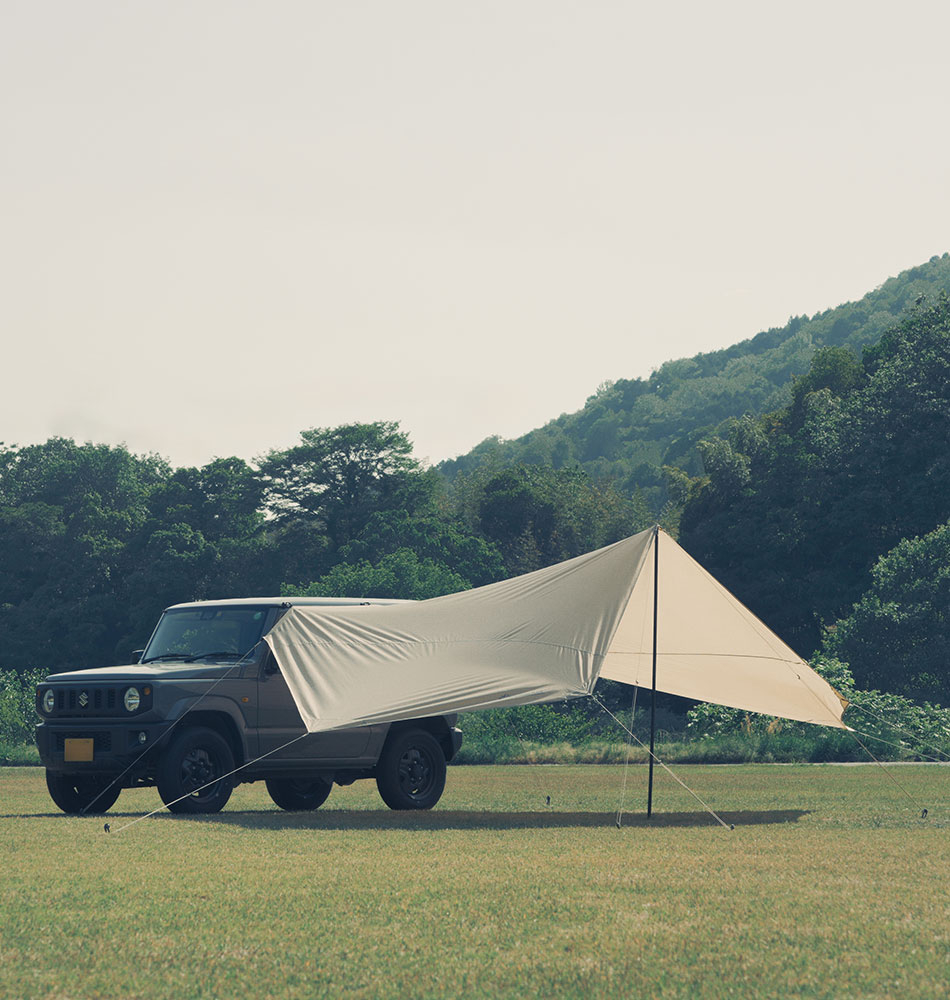 タープと車両を先に接続し、最後にポールの設営を行うとスムーズです。車両に接近した設営方法のため、車両との接触に十分ご注意ください。