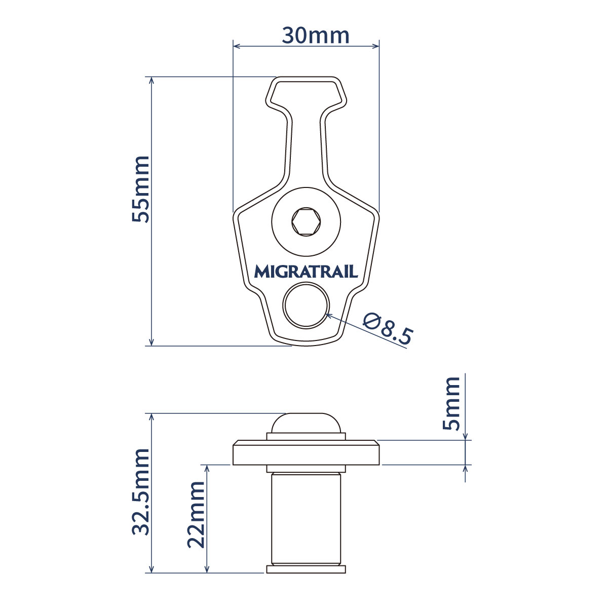 フックプレートはガイロープやバンジーコードが掛けやすい形状。中心の穴はガイロープなどを強固に縛り付けることができ、DIYを考慮しM8ボルト用穴サイズに設計。
