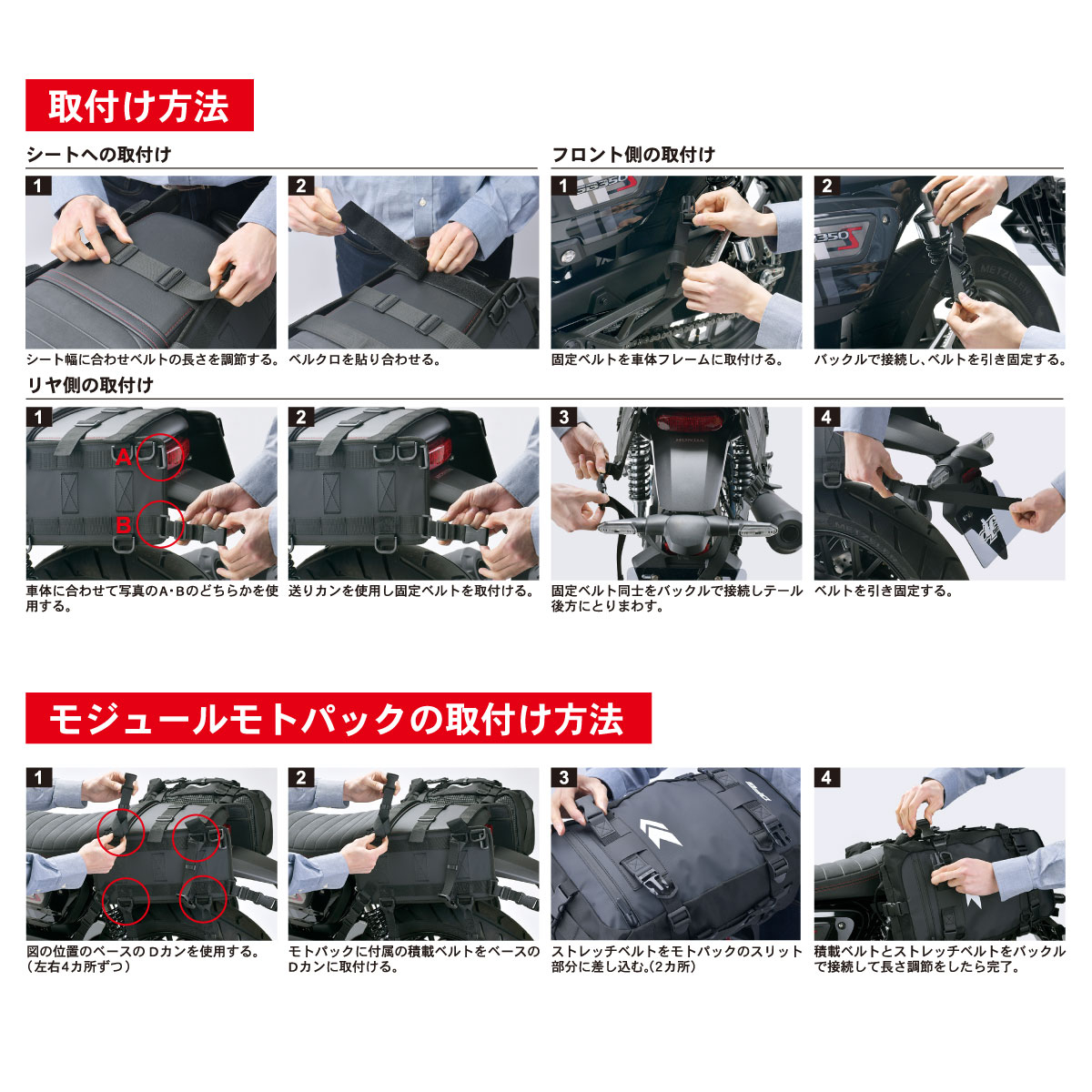 - モジュールモトパックは完全防水ではありませんので貴重品などを収納する際は防水対策をした上でご使用ください。