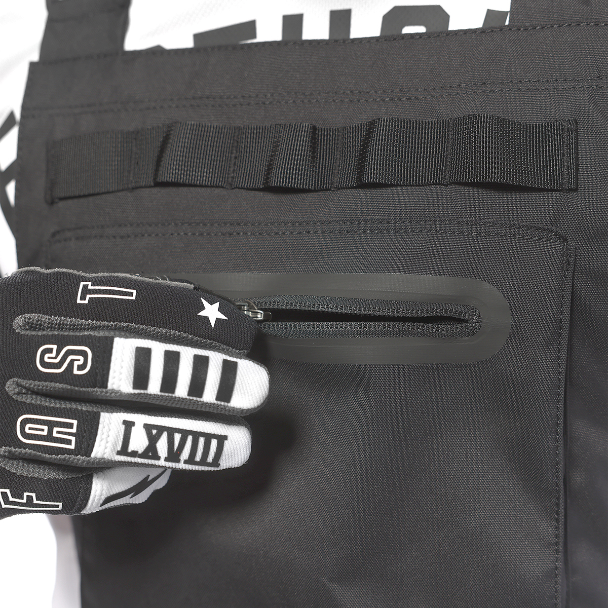 *胸部に無線機やツールを固定できるMOLLEストラップ。