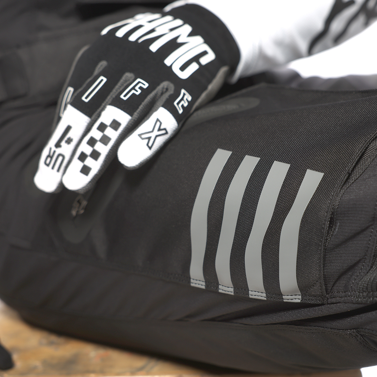 グラインドハウスパンツをベースに、新たに膝内側へレザー補強を追加したモデル。複数のジッパーポケットで収納力と通気性を確保し、幅広の伸縮ストラップで着脱もスムーズ。