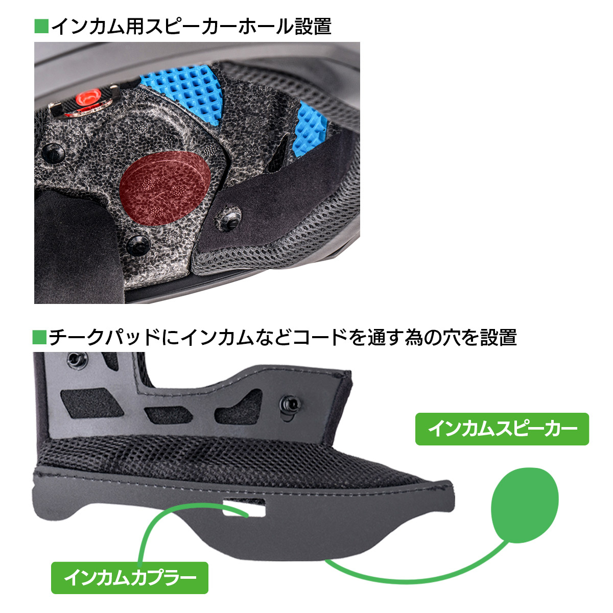 インカム用スピーカーホールを装備。チークパッドにコードを通すための穴を配置し、スマートな配線処理が可能。