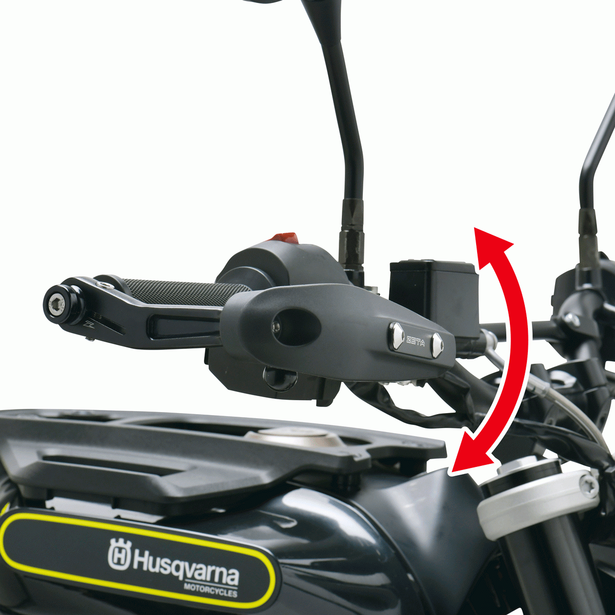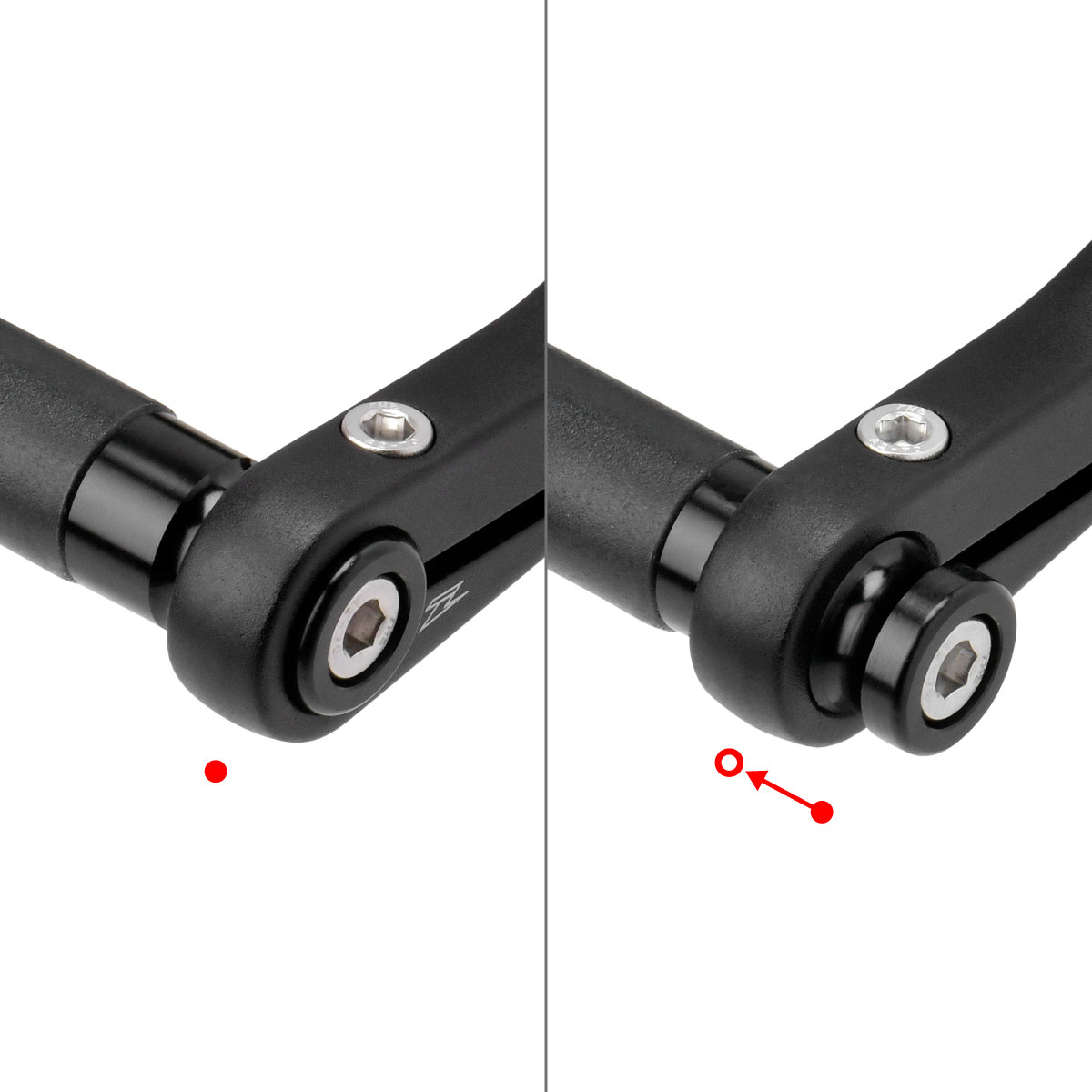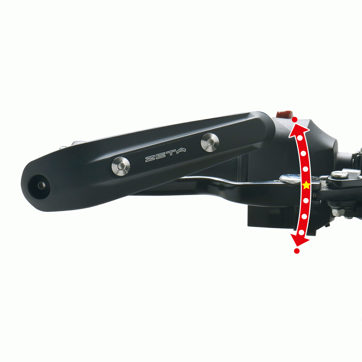 アームボルトを緩めることで、バーエンドを軸に上下無段階の角度調節が可能。プロテクターの高さを好みの位置に調整可能。 -