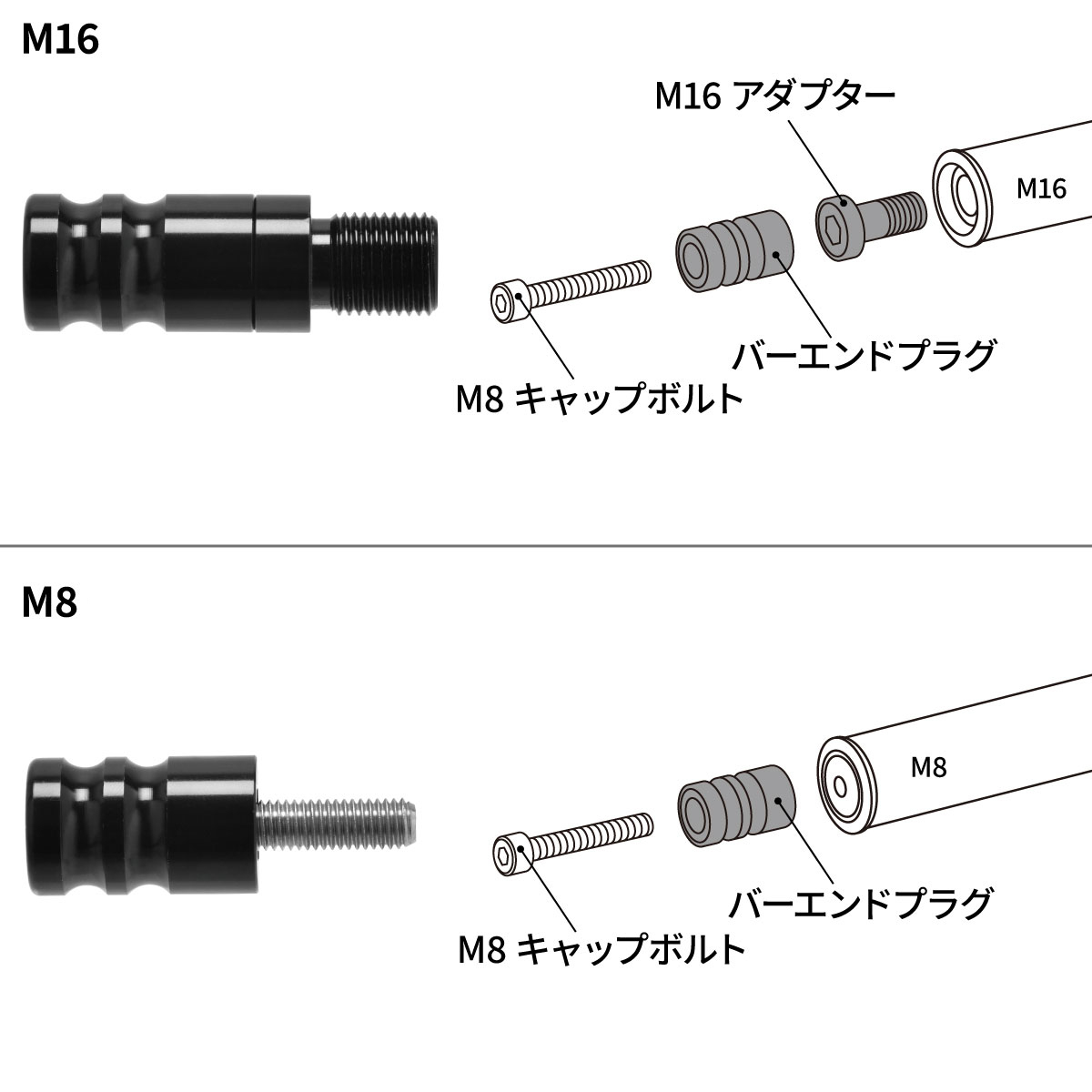 - ハンドルバーエンドがM16 ピッチ1.5mmの加工がされているハンドルバーに取り付け可能。